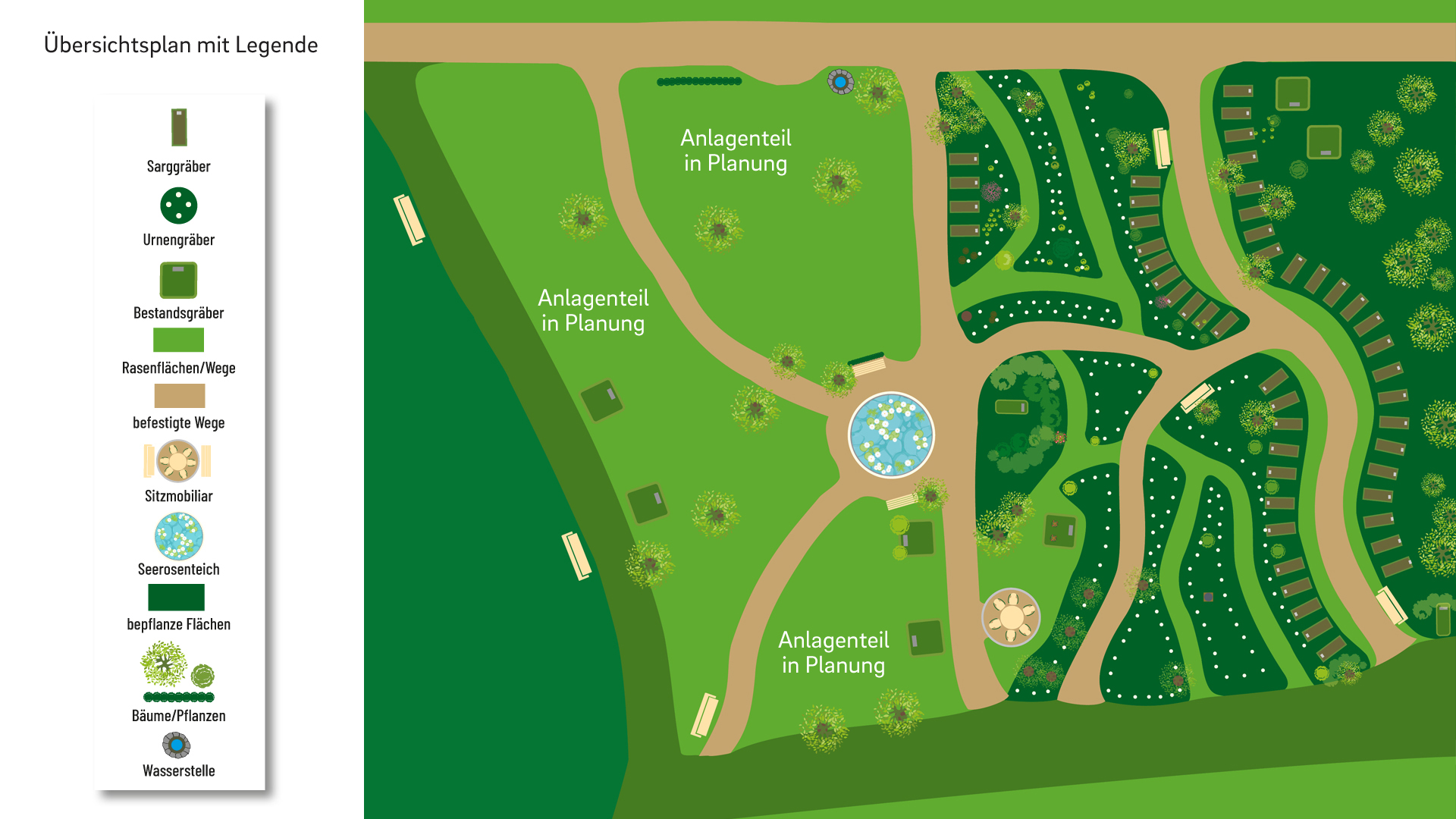 Auf Klick können Sie den Belegungs- und Gestaltungsplan der Gemeinschaftsgrabanlage auf dem Waldfriedhof Lauheide zur Ansicht vergrößern. Die Legende links gibt Aufschluss über Gestaltungsdetails.